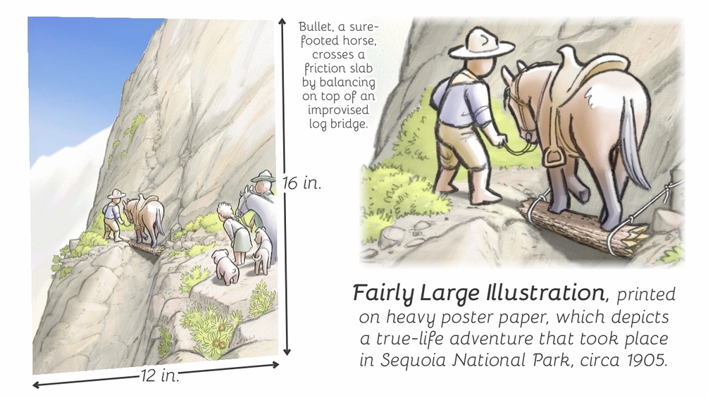 This bright sketch (16 inches tall by 12 inches wide) depicts a historic incident that took place in the early 20th century, in what is now Sequoia National Park. Additional details can be found in a delightful travelogue, by Stewart Edward White: https://archive.org/details/passwhite00whitiala/mode/2up