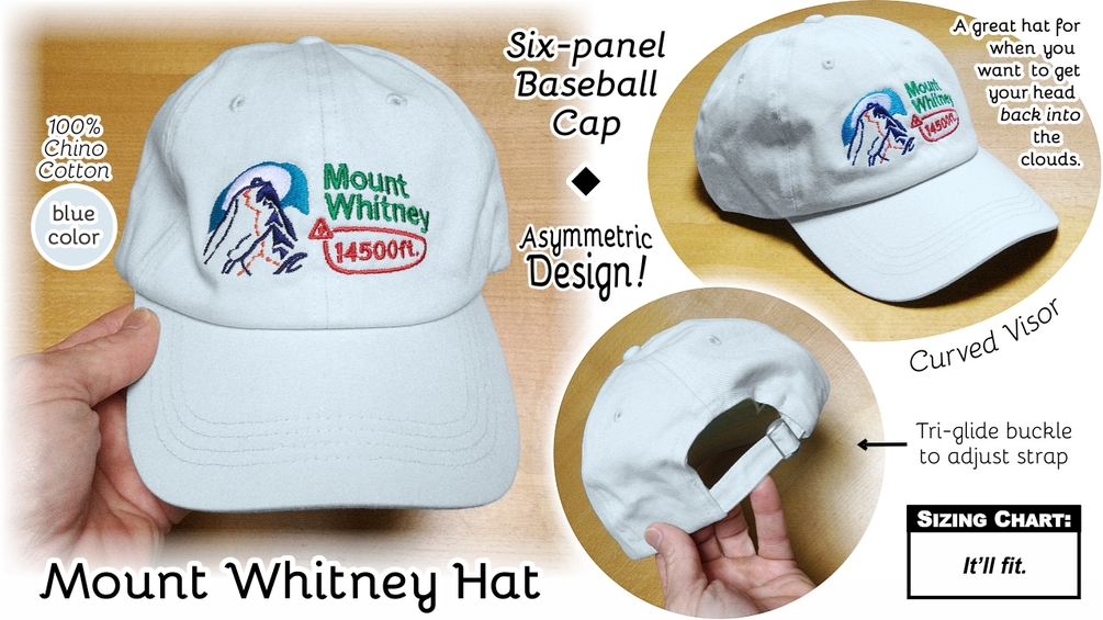 You'll recieve a standard-sized six-panel baseball cap, pastel blue in color, embroided with an asymmetric logo of a famous mountain in California's Sierra Nevada.