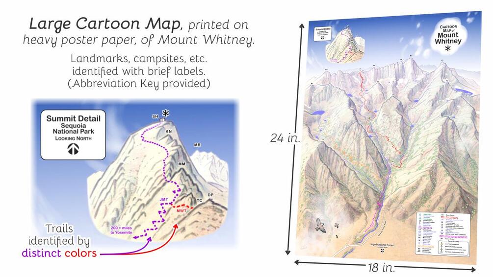 A splashy cartoony-style map (18 inches wide by 24 inches tall) of Mount Whitney, the high point of California's Sierra Nevada range, and the highest mountain in the conterminous United States.